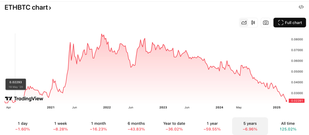 قیمت اتریوم در برابر بیت کوین (ETH/BTC) در حال حاضر ۰.۰۲۲۵ BTC است که پایینترین سطح آن در تقریباً ۵ سال اخیر محسوب میشود.