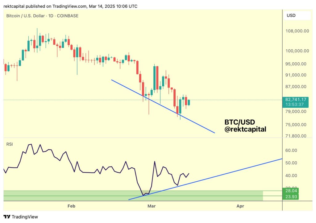 به گزارش میهن بلاکچین، رکت کپیتال (Rekt Capital) توییتی منتشر و اعلام کرد شاخص قدرت نسبی (RSI) بیت کوین در نمودار روزانه نشانههایی از واگرایی صعودی نشان میدهد.