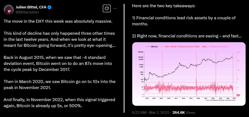 پست او در شبکه اجتماعی X نشان میدهد که پس از کاهش شدید شاخص DXY در نوامبر ۲۰۲۲، قیمت بیت کوین رشد چشمگیری را تجربه کرد. همین اتفاق پس از سقوط دلار از ۹۹.۵ به ۹۵ در اوایل بحران کووید-۱۹ در مارس ۲۰۲۰ رخ داد. تحلیل او تأکید میکند: