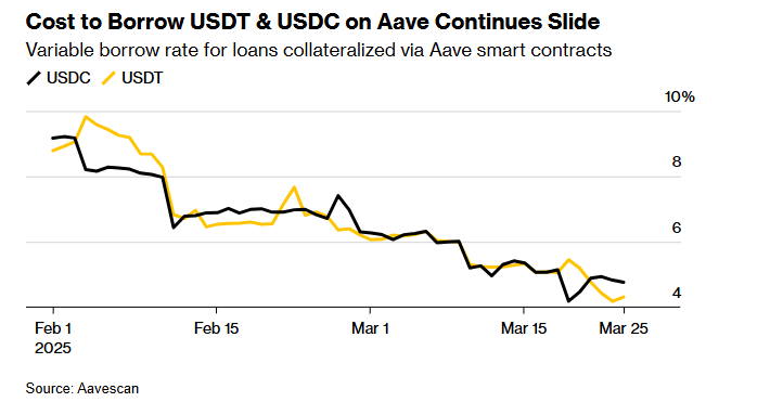 در نشانهای دیگر از کاهش ریسکپذیری در بازار، نرخ وامدهی استیبلکوینهایی مانند تتر (USDT) و یواسدیسی (USDC) در پلتفرم وامدهی غیرمتمرکز آوه (Aave) به حدود ۴٪ کاهش یافته است. این امر نشاندهنده احتیاط سرمایهگذاران و کاهش تمایل آنها برای استفاده از اهرم در معاملات است.