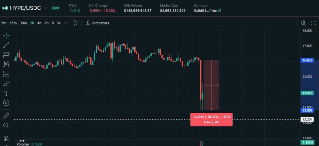همزمان با این اتفاقات، قیمت توکن HYPE، ارز دیجیتال بومی هایپرلیکویید تا ۲۲٪ سقوط کرد. با این حال در زمان نگارش بخشی از این ضرر جبران شده است.