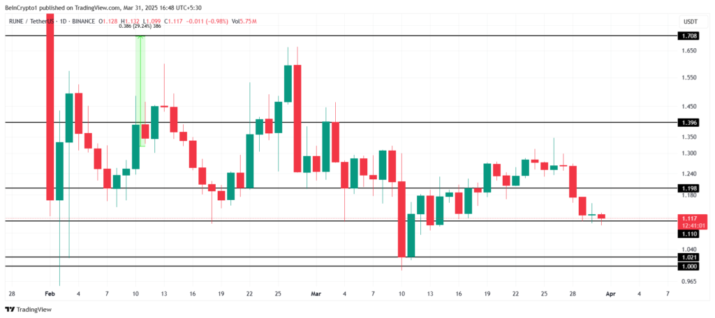 قیمت رون در زمان نگارش مطلب معادل ۱.۱۱۹ دلار است و دقیقاً بالاتر از سطح حمایتی ۱.۱۱۰ دلار معامله میشود. برای بازیابی احتمالی قیمت، این آلت کوین باید سطح ۱.۱۹۸ دلار را به عنوان حمایت بازپس گیرد. احساسات سرمایهگذاران در تعیین حرکت صعودی RUNE نقشی کلیدی ایفا خواهد کرد و ممکن است منجر به افزایش قیمت آن شود.