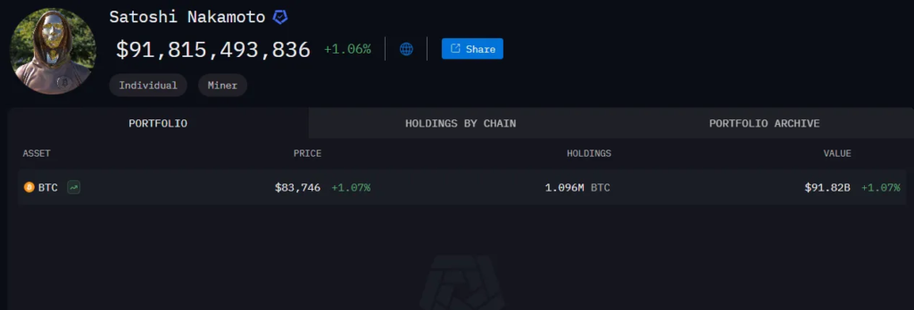 کیف پول ساتوشی که گمان میرود حاوی ۱.۰۹۶ میلیون بیت کوین (BTC) باشد، از اوایل سال ۲۰۱۰ دستنخورده باقی مانده است. طی دهه گذشته، ارزش آن بیش از ۳۳۳ برابر افزایش یافته و با توجه به قیمتهای فعلی اکنون از ۹۱ میلیارد دلار فراتر رفته است.