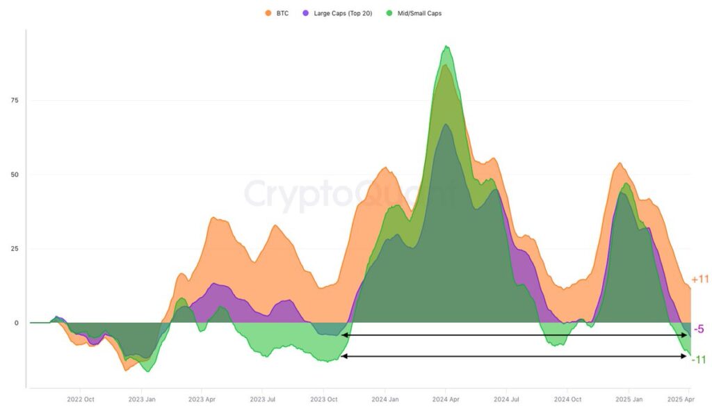 این تحلیلگر با استناد به نمودار بالا تاکید کرده که در حال حاضر بیت کوین نسبت به آلت کوینهای بزرگ، متوسط و کوچک رشد سریعتری را تجربه میکند. به گفته او، این اختلاف در مومنتوم رشد به سطحی رسیده که آخرین بار در اکتبر ۲۰۲۳ مشاهده شده است. در آن زمان، بازار آلت کوینها یک رشد مقطعی را تجربه کرد اما در نهایت بیت کوین دوباره سلطه خود بر بازار را پس گرفت.
