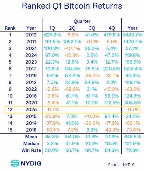 طبق دادههای NYDIG، عملکرد ضعیف در سهماهه نخست لزوماً بهمعنای وضعیتی فاجعهبار برای بیت کوین نیست. این دارایی در نیمی از سالهایی که در ابتدای سال با افت مواجه شده، موفق به بازگشت شده است.