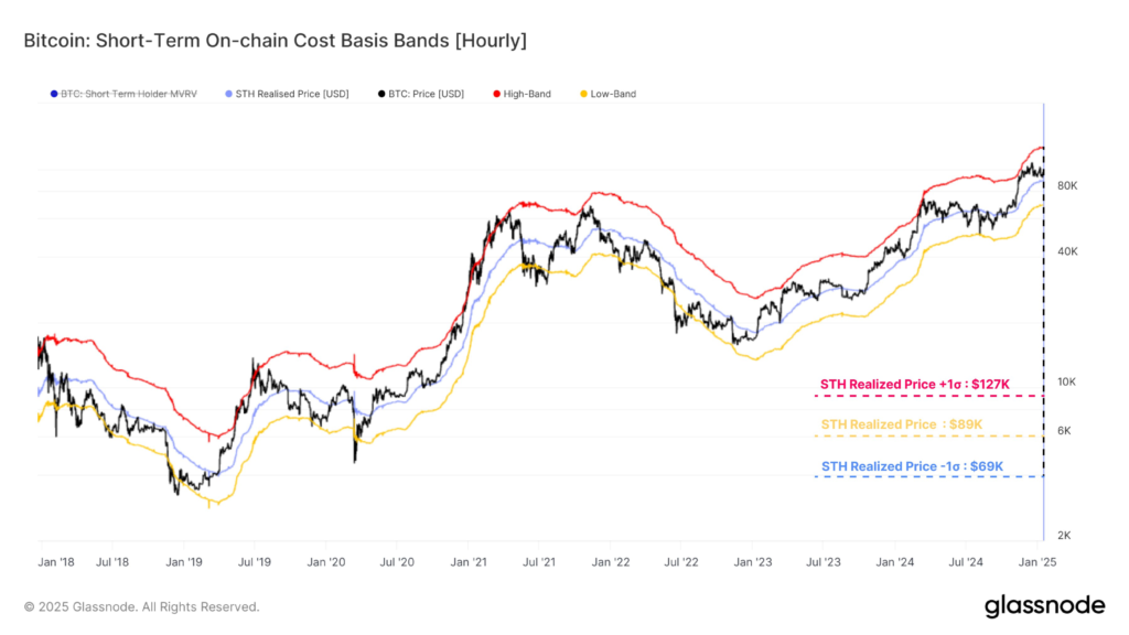 از سوی دیگر، نوارهای قیمت تحققیافته هولدرهای کوتاهمدت (STH) طبق دادههای «گلسنود» نشان میدهد که میانگین قیمت خرید این گروه از سرمایهگذاران هماکنون در سطح «۸۹٬۰۰۰» دلار قرار دارد، درحالیکه باند منفی یک انحراف معیار در سطح «۶۹٬۰۰۰» دلار واقع شده است.