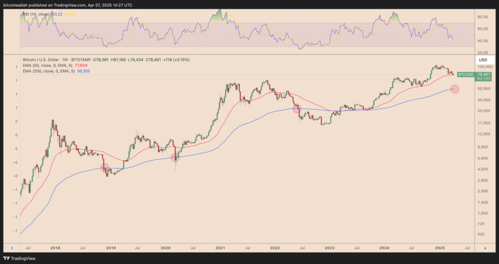 بیت کوین در حال حاضر در حال آزمودن یک سطح تکنیکال کلیدی است: میانگین متحرک نمایی ۵۰ هفتهای (۵۰-week EMA) که از نظر تاریخی مرز میان فازهای صعودی و نزولی در بازار محسوب میشود.