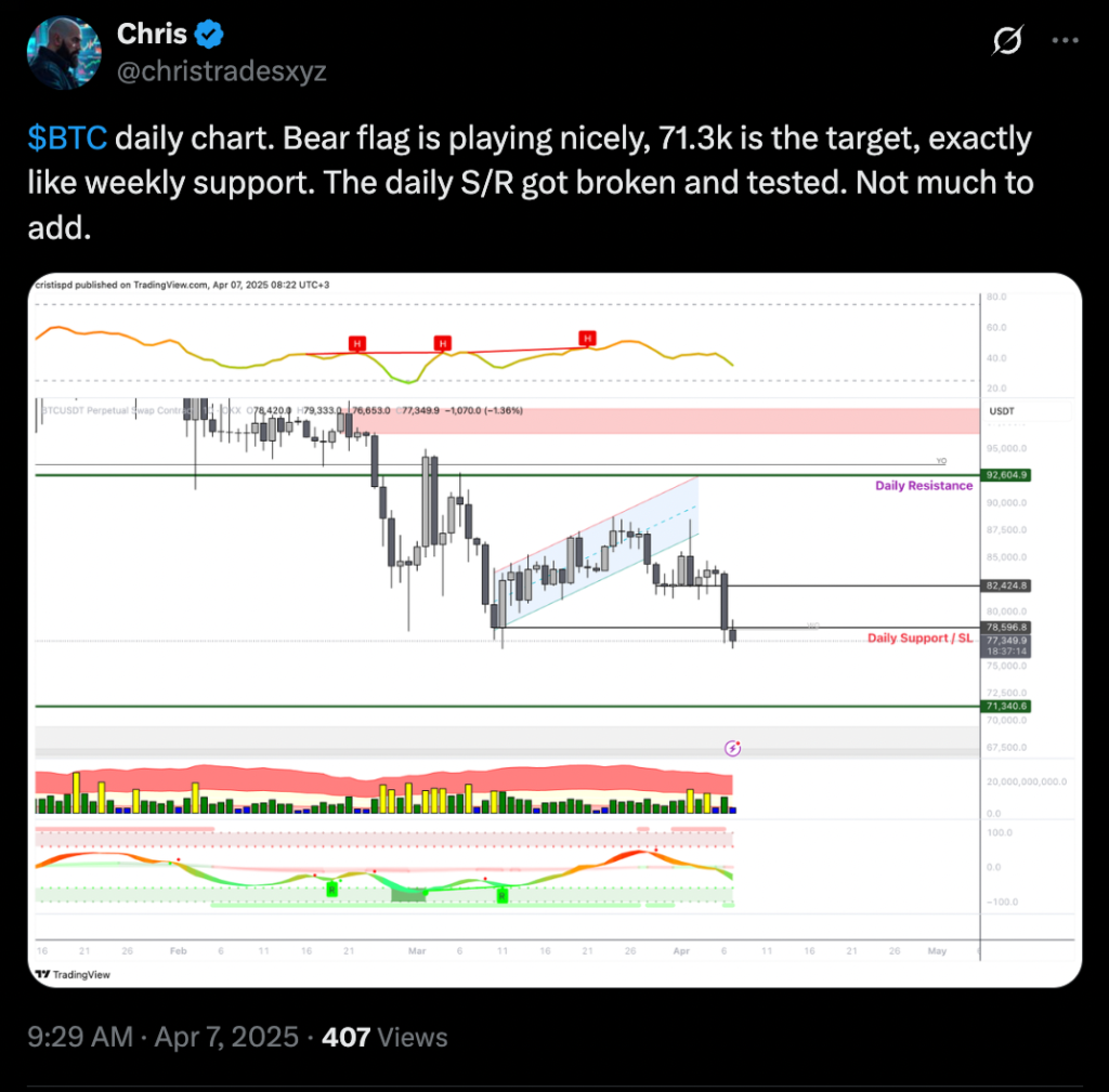 قیمت بیت کوین در تاریخ ۷ آوریل (۱۸ فروردین) به پایینترین سطح چهارماهه خود یعنی «۷۴٬۵۰۰» دلار رسید و دادهها نشان میدهند که احتمالاً هنوز به کف قیمتی نرسیده است.