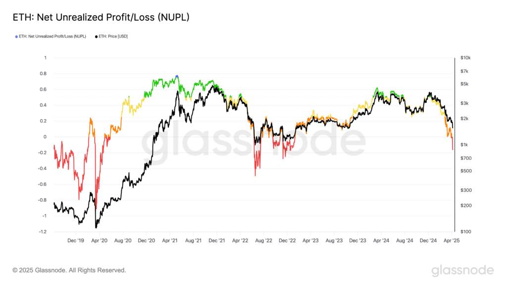 شاخص سود/زیان تحققنیافته خالص اتریوم (NUPL) وارد ناحیه «تسلیم» یا Capitulation شده است؛ مرحلهای در زنجیره بلاکچین که در آن بیشتر سرمایهگذاران اتریوم را با ضرر هولد میکنند. در چرخههای قبلی، ورود به این ناحیه معمولاً در نزدیکی کفهای اصلی بازار رخ داده است.
