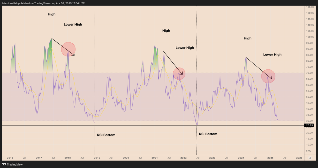 در دسامبر ۲۰۲۴، اتریوم سقفی بالاتر در حدود ۴,۰۹۵ دلار ثبت کرد، در حالی که RSI سقفی پایینتر ایجاد کرد؛ همان واگرایی نزولی که در سقفهای قبلی نیز دیده شده بود. این واگرایی نشانهای از آغاز یک اصلاح شدید قیمت، مشابه با الگوهای سالهای ۲۰۱۸ و ۲۰۲۲ بود.