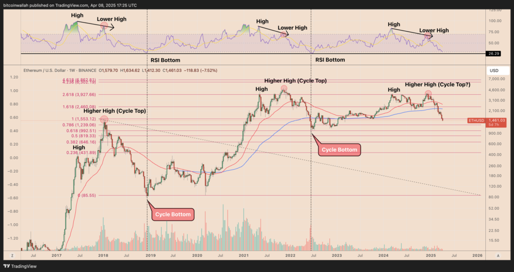 عملکرد فعلی قیمت اتر شباهت زیادی به الگوی فرکتالی دارد که در سالهای ۲۰۱۸ و ۲۰۲۲ مشاهده شد. در هر دو دوره، قیمت اتریوم ابتدا رشد چشمگیری داشت و سپس با افت شدید و ورود به یک بازار نزولی بلندمدت مواجه شد.