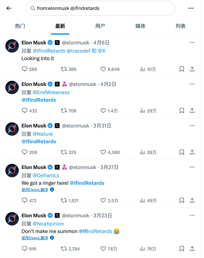با جستوجوی عبارت «from:elonmusk @ifindretards» در صفحه ایلان ماسک، بهراحتی میتوان فهمید که این دو حساب در ۳۵ روز گذشته ۲۲ بار با یکدیگر تعامل داشتهاند که ۱۱ بار از آن بهصورت مستقیم تگ بوده است؛ این عدد بسیار بیشتر از میانگین تعامل ماسک با حساب رسمی تسلا (بین ۳ تا ۵ بار در ماه) است.