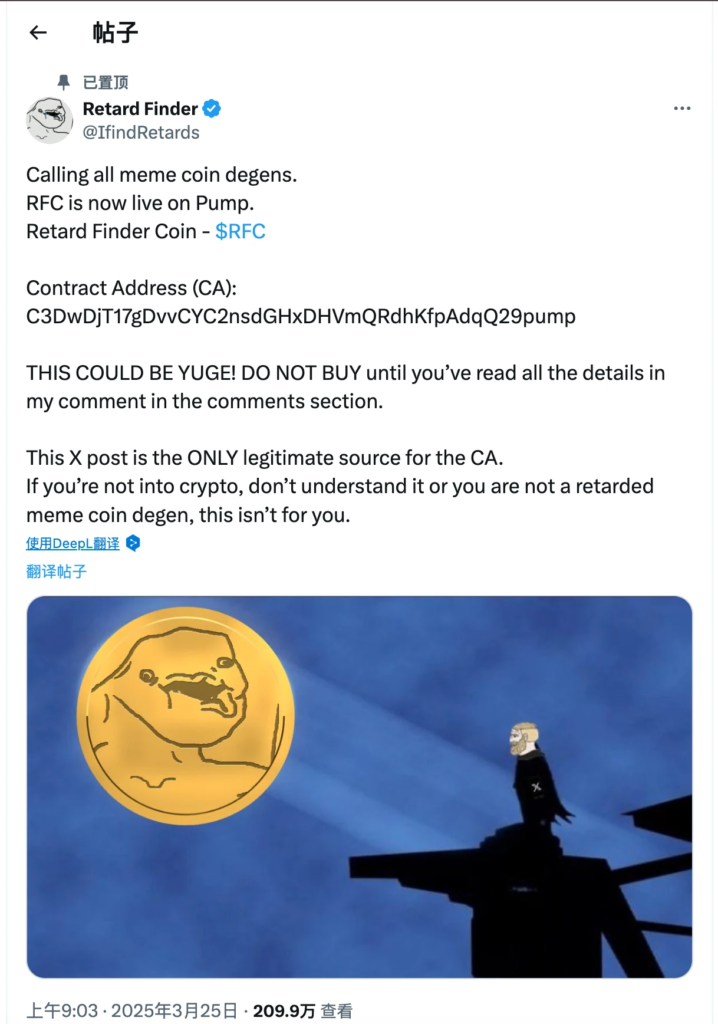 در تاریخ ۷ آوریل (۱۸ فروردین)، در حالی که کل بازار رمزارزها در رکود و کاهش شدید قیمتها غرق شده بود،یک پروژه میم با مضمون ایلان ماسک به نام RFC (مخفف Retard Finder Coin) برخلاف روند بازار حرکت کرد و باعث توجه ناگهانی شد.