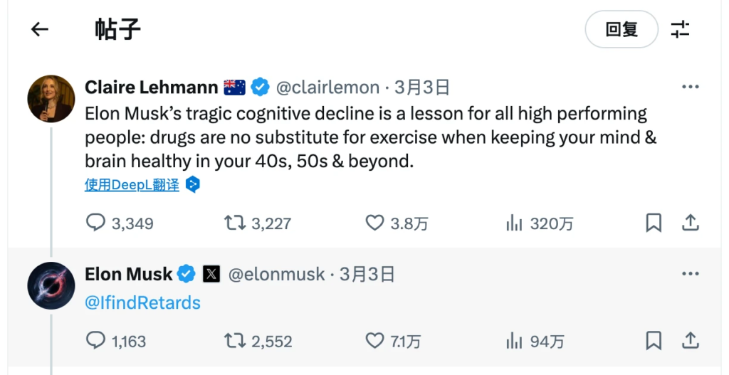 در مارس ۲۰۲۵ (اسفند ۱۴۰۳)، ماسک هنگام پاسخ به پستی که او را به زوال شناختی متهم کرده بود، مستقیماً حساب ریتارد فایندر را تگ کرد. پیشتر، کلیر لمان (Claire Lehmann) بنیانگذار نشریه کیلت (Quillette) ادعا کرده بود که ماسک به جای ورزش، به دارو برای حفظ هوشیاری ذهنی خود تکیه دارد. ماسک در واکنش به این موضوع با تگ کردن ریتارد فایندر، بهطور کنایهآمیز نوشت «یکی پیدا شد»؛ این تعامل نهتنها باعث افزایش دیدهشدن حساب شد، بلکه بهنوعی تأیید ماسک نسبت به فرهنگ «ترولگونه» این حساب تلقی گردید.