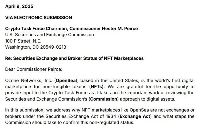 به گزارش میهن بلاکچین، در نامهای که در تاریخ ۹ آوریل (۲۰ فروردین) به «هستر پیرس» (Hester Peirce)، کمیسیونر SEC و مسئول گروه ویژه رمزارزها در این نهاد ارسال شد، «ادل فور» (Adele Faure) مشاور عمومی و «لورا بروکاور» (Laura Brookover) معاون مشاور عمومی اوپنسی تأکید کردند که SEC باید «بهوضوح اعلام کند بازارهای NFT مانند اوپن سی مصداق صرافی تحت قوانین اوراق بهادار ایالات متحده محسوب نمیشوند».