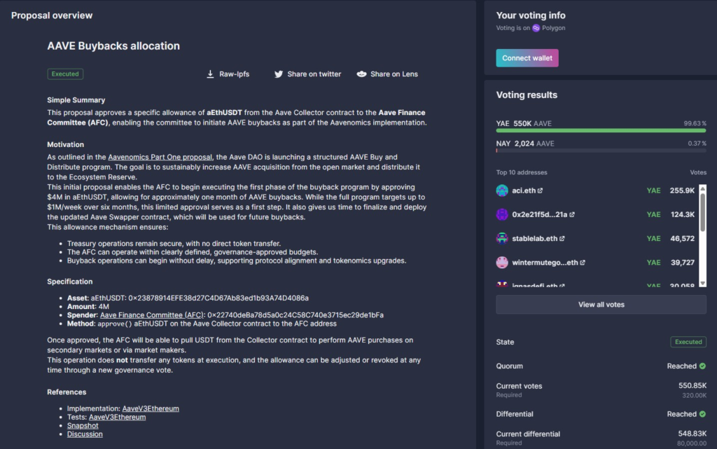 این پروپوزال که در تاریخ ۹ آوریل (۲۰ فروردین) اعلام شد، با حمایت بیش از ۹۹٪ از هولدرهای توکن AAVE به تصویب رسید و به پروتکل اجازه میدهد تا مبلغ ۴ میلیون دلار از توکنهای AAVE را از بازار خریداری کند؛ مبلغی که برای بازخریدهای یکماهه کافی خواهد بود.