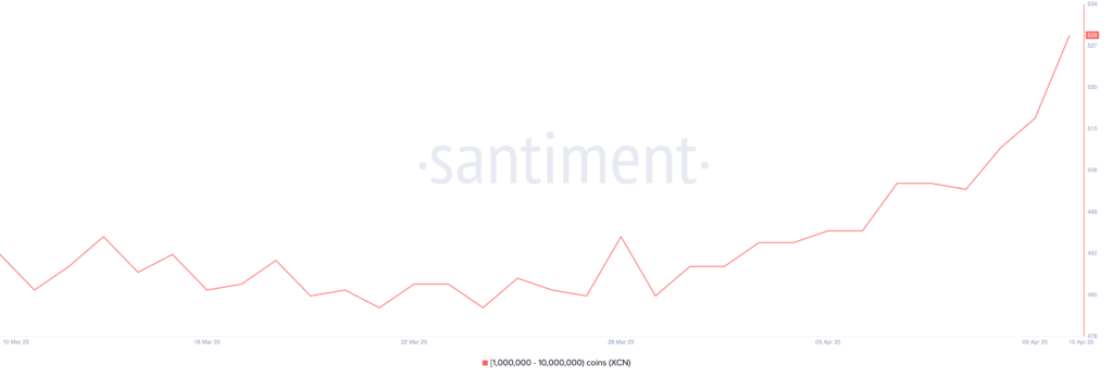 تعداد آدرسهایی که بین ۱ تا ۱۰ میلیون توکن XCN نگه میدارند در تاریخ ۷ تا ۱۰ آپریل (۱۸ تا ۲۱ فروردین)، از ۵۰۳ به ۵۳۲ افزایش یافته که نشان از بازگشت علاقه نهنگها به این توکن دارد.