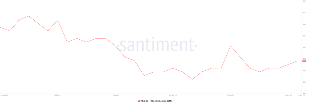 با افزایش توجه به این روایت، توکن OM میتواند رشد قابل توجهی را تجربه کند. تعداد آدرسهای نهنگی که بین ۱۰,۰۰۰ تا ۱۰۰,۰۰۰ توکن مانترا در اختیار دارند، از ۳۸۶ به ۳۸۹ افزایش یافته که نشان از انباشت آهسته و خاموش دارد.