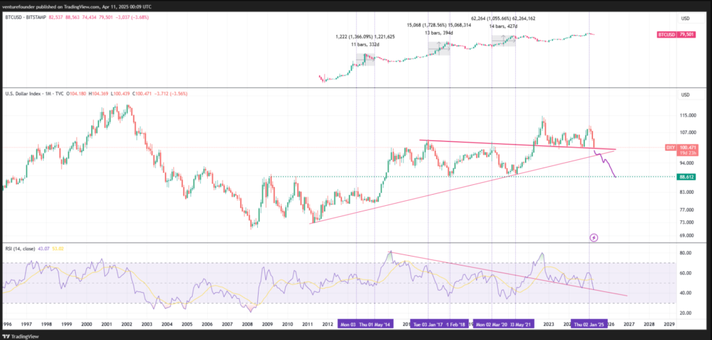 افت DXY معمولاً یک سیگنال بسیار صعودی برای بیت کوین بوده است.