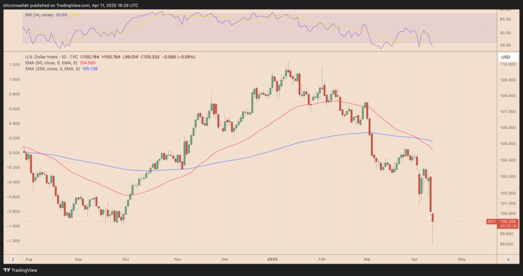 دلار آمریکا نیز به این فشار افزود، زیرا براساس شاخص دلار آمریکا (DXY) قدرت آن در برابر سبدی از ارزهای خارجی برای نخستینبار از سال ۲۰۲۲ به زیر سطح ۱۰۰ سقوط کرد. این کاهش همچنین بدترین افت هفتگی در بیش از ۲ سال گذشته را رقم زد.