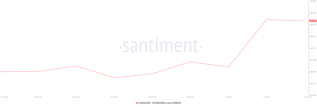 توکن اوندو که در دسته داراییهای مبتنی بر دنیای واقعی (RWA) قرار میگیرد، نیز این هفته در کانون توجهات نهنگها قرار داشته است. بر اساس دادههای سنتیمنت، طی هفت روز گذشته، نهنگهایی که بین ۱ میلیون تا ۱۰ میلیون واحد ONDO در اختیار دارند، بیش از ۱۹.۴۱ میلیون واحد از این توکن را به ارزش تقریبی ۱۷ میلیون دلار خریداری کردهاند.