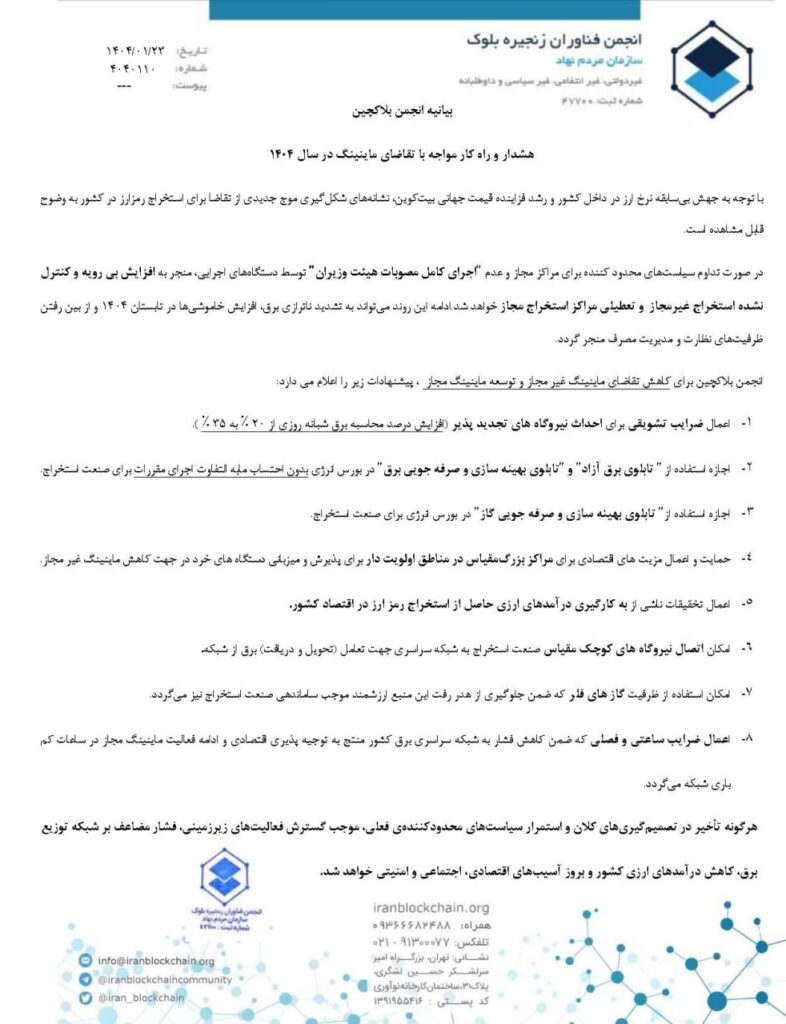 انجمن بلاکچین ایران با انتشار بیانیهای رسمی نسبت به افزایش غیرقابل کنترل استخراج رمزارز در کشور هشدار داده و راهکارهایی برای مهار این وضعیت و جلوگیری از آسیبهای احتمالی ارائه کرده است.