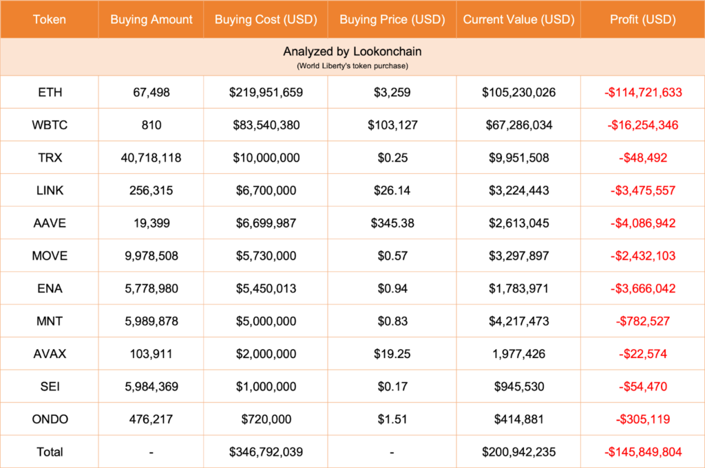 به گفته پژوهشگر بلاکچین لوک آنچین، WLFI تاکنون ۳۴۶.۸ میلیون دلار صرف خرید ۱۱ توکن مختلف کرده، اما تا تاریخ ۱۲ آوریل (۲۳ فروردین) هنوز موفق به کسب سود از هیچکدام از این سرمایهگذاریها نشده است. سرمایهگذاریهای این پروژه روی اتریوم تا به حال بیش از ۱۱۴ میلیون دلار ضرر داشته است.