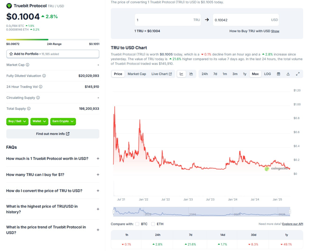 تروبیت در سال ۲۰۱۷ راهاندازی شد و توکن TRU خود را در سال ۲۰۲۱ عرضه کرد. ارزش بازار کاملا رقیق شده (FDV) این توکن در حال حاضر ۲۰ میلیون دلار است.