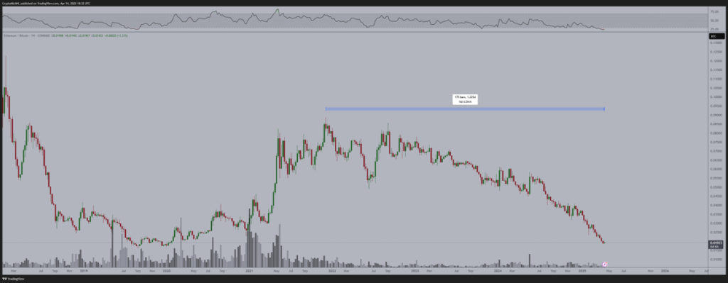بازار خرسی اتریوم تا این لحظه ۱,۲۲۵ روز به طول انجامیده، در حالی که قیمت طلا در این بازه ۲ برابر شده است. همچنین اندیکاتور RSI در تایم فریم هفتگی برای ETH به پایینترین سطح خود رسیده است.