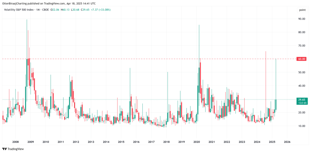 در تاریخ ۷ آوریل (۱۸ فروردین)، جهش نادر شاخص نوسانات بورس آپشن شیکاگو (VIX) تا سطح ۶۰ اتفاق افتاد؛ سطحی که بهعنوان معیاری از ترس و بلاتکلیفی شدید در بازار شناخته میشود.