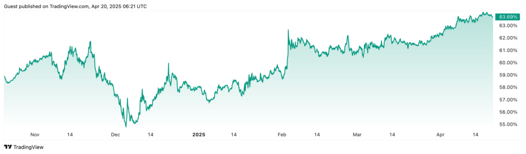 دامیننس بیت کوین در زمان نگارش این مطلب ۶۳.۷۱٪ بوده و از پیشبینی بسیاری از تحلیلگران برای پایان سال ۲۰۲۴ (حدود ۶۰٪) بیشتر است.