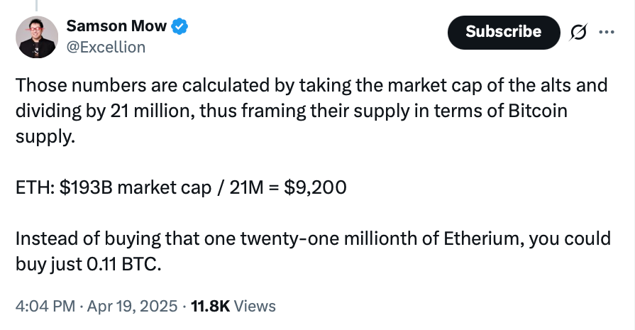 سمسون مو (Samson Mow) – ماکسیمالیست بیت کوین و مدیرعامل شرکت Jan3 – معتقد است وقتی سوگیری واحد (Unit Bias) را از آلت کوینها حذف کنیم، مشخص میشود که توکنهایی مثل اتریوم، ریپل و سولانا تا چه اندازه بیش از حد ارزش گذاری شدهاند.