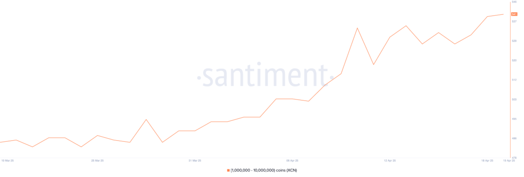 با وجود این کاهش، انباشت همچنان ادامه دارد. تعداد نهنگهایی که بین ۱ تا ۱۰ میلیون XCN در اختیار دارند، از ۵۲۸ آدرس در تاریخ ۱۶ آپریل (۲۷ فروردین) به ۵۴۱ واحد افزایش یافته که نشاندهنده خرید برخی از دارندگان بزرگ در افت قیمت است.