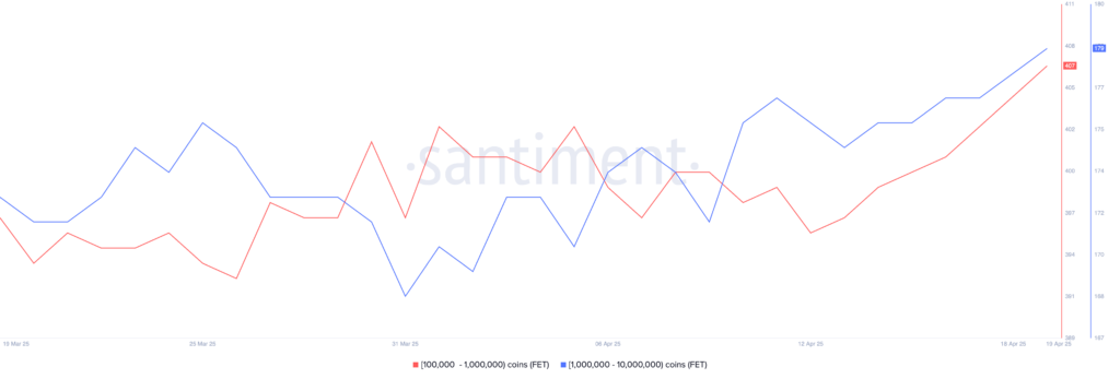 تعداد نهنگهایی که بین ۱۰,۰۰۰ تا ۱,۰۰۰,۰۰۰ FET دارند از ۵۷۲ کیف پول در تاریخ ۱۳ آپریل (۲۴ فروردین)، به ۵۸۶ مورد در ۱۹ آپریل (۳۰ فروردین) افزایش یافته است.