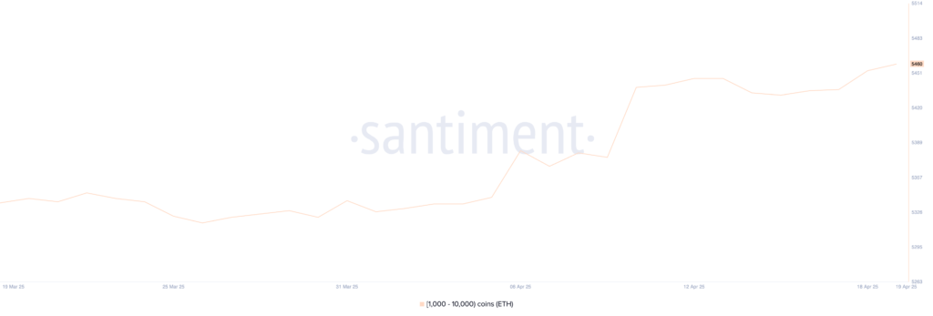 تعداد کیف پولهایی که بین ۱,۰۰۰ تا ۱۰,۰۰۰۰ ETH نگهداری میکنند از تاریخ ۱۵ آپریل (۲۶ فروردین) بهطور مداوم رو به افزایش بوده است. در آن زمان، ۵,۴۳۲ آدرس در این محدوده وجود داشت، اما اکنون این تعداد به ۵,۴۶۰ رسیده که بالاترین میزان از آگوست ۲۰۲۳ تاکنون بهشمار میرود.
