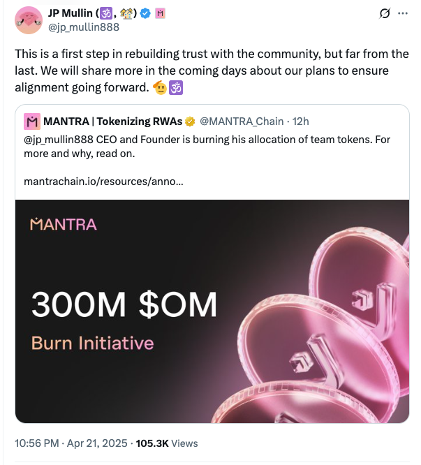 جان پاتریک مولین (John Patrick Mullin) – بنیانگذار و مدیرعامل بلاکچین مانترا – قصد دارد ۱۵۰ میلیون توکن OM را بسوزاند تا عرضه کل توکنها را به ۱.۶۷ میلیارد کاهش دهد. همچنین قرار است ۱۵۰ میلیون دیگر از سوی شرکای کلیدی اکوسیستم مانترا سوزانده شود.