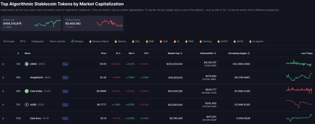 استیبل کوینهای الگوریتی که بدون پشتوانه مستقیم دارایی سعی در حفظ ارزش خود دارند، زمانی یک نوآوری تحولساز در دنیای دیفای محسوب میشدند. اما طبق دادههای کوینمارکتکپ (CoinMarketCap) در آپریل سال ۲۰۲۵، ارزش بازار کل استیبل کوینها حدوداً ۲۳۴ میلیارد دلار و سهم استیبل کوینهای الگوریتمی تنها ۴۵۸ میلیون دلار (معادل ۰.۲٪) است.