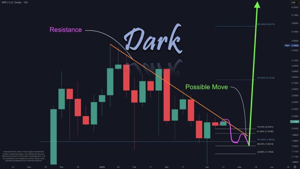 دارک دیفندر (Dark Defender)، تریدر معروف با استناد به نمودار هفتگی که در آن قیمت ریپل بالای ۲ دلار تثبیت شده میگوید این آلت کوین در حال بازآزمایی یک خط مقاومت چند ماهه مهم است. به عقیده او، شکسته شدن این مقاومت موج پنجم الیوت را فعال کرده و میتواند را تا ۴ دلار افزایش دهد. وی در این باره نوشته است: