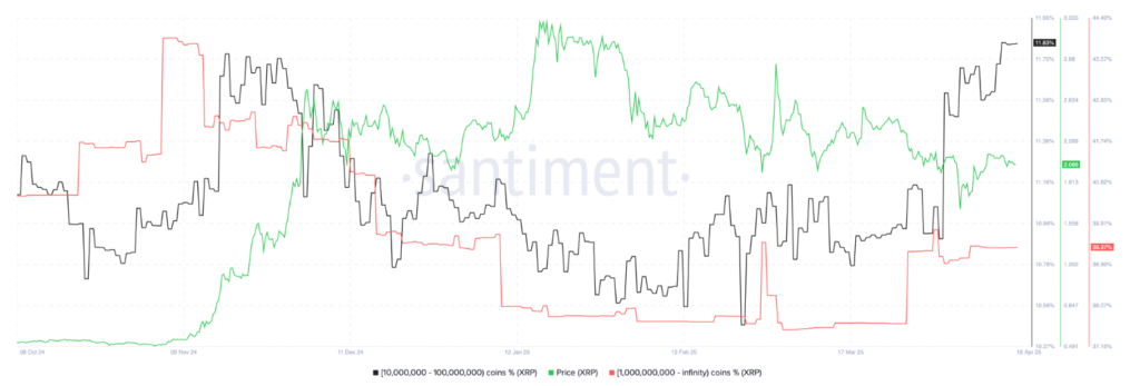 بر اساس دادههای شرکت سنتیمنت، تعداد آدرسهای حاوی ۱۰ تا ۱۰۰ میلیون واحد ریپل (منحنی مشکی در نمودار)، از ابتدای ماه آپریل به طور چشمگیری افزایش یافته است. همچنین تعداد آدرسهایی که بیش از یک میلیارد ریپل دارند (منحنی قرمز در نمودار) نیز به طور پیوسته در حال افزایش است. این گروه از نهنگها اکنون مالک ۳۹.۴٪ از کل عرضه ریپل هستند، در حالی که این رقم در پایان ماه مارس حدود ۳۷.۷٪ بود.