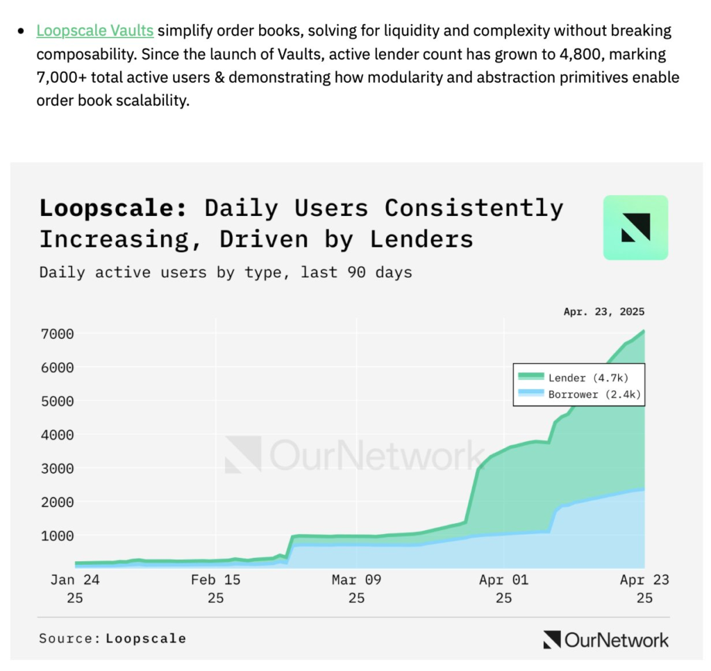 به گفته لوپسکیل در اطلاعیهای که در آوریل به اشتراک گذاشته شده، این پروتکل همچنین از بازارهای وامدهی تخصصی مانند «اعتبار ساختاریافته، تأمین مالی مطالبات و وامهای بدون پشتوانه» پشتیبانی میکند. مدل مبتنی بر دفتر سفارش (Order Book) لوپسکیل باعث میشود که این پروتکل از سایر پلتفرمهای وامدهی دیفای مانند آوه (Aave) که سپردههای رمزارزی را در استخرهای نقدینگی تجمیع میکنند، متمایز باشد.