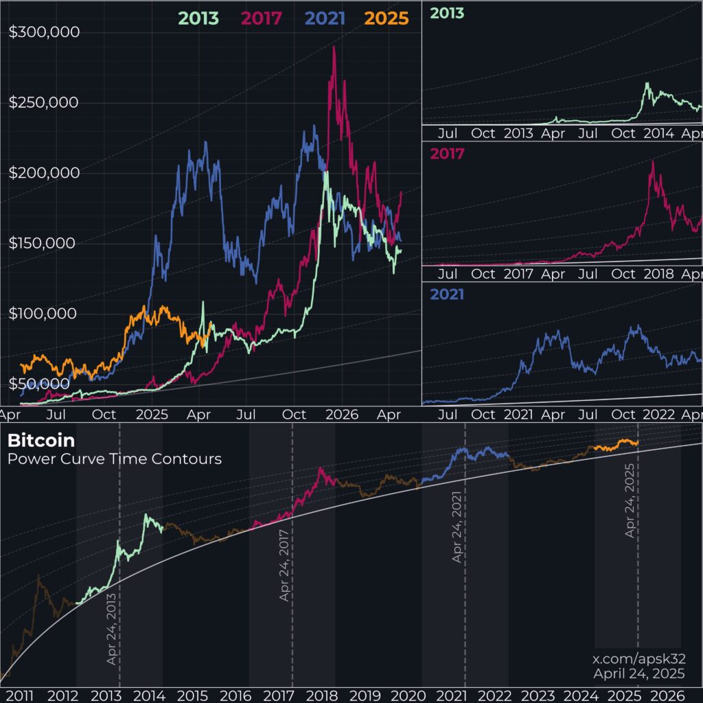 با این حال، تحلیلگر ناشناس بیت کوین که با نام apsk32 فعالیت میکند، پیشبینی کرده که قیمت بیت کوین در سال ۲۰۲۵ میتواند به ۲۰۰,۰۰۰ دلار هم برسد. این پیشبینی بر مبنای خطوط زمانی منحنی توان بیت کوین است که حرکات قیمتی BTC در چرخههای چهار ساله ۲۰۱۳، ۲۰۱۷، ۲۰۲۱ و ۲۰۲۵ را روی هم قرار میدهد. این نمودار عملکرد قدرتمند بیت کوین در سهماهه سوم و چهارم ۲۰۲۵ را نشان میدهد و این تحلیلگر تایید کرده که چرخه ۴ ساله تاریخی بیت کوین همچنان برقرار است. وی گفت: