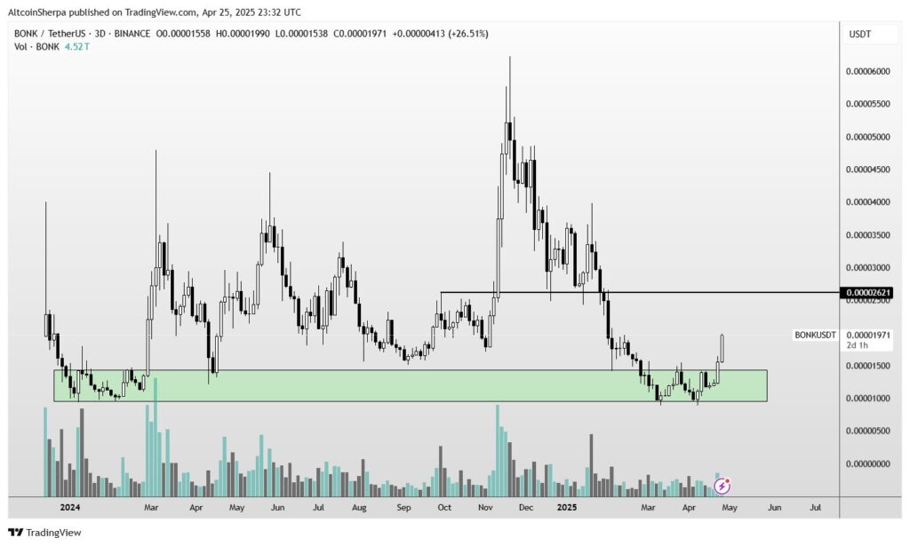آلت کوین شرپا نموداری را به اشتراک گذاشته که نشان میدهد توکن بونک میتواند پس از عبو از مقاومت ۰.۰۰۰۰۱۴۲ دلار تا محدوده ۰.۰۰۰۰۲۶۲ دلار رشد کند. او گفت: