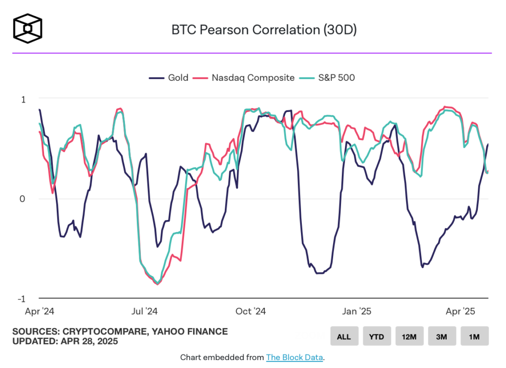 روز جمعه، ۲۵ آپریل (۵ اردیبهشت) همبستگی پیرسون ۳۰ روزه (30day Pearson Correlation) بیت کوین و طلا به ۰.۵۴ رسید، در حالی که به سقف سالانه خود (۰.۷۳) نزدیک شد.