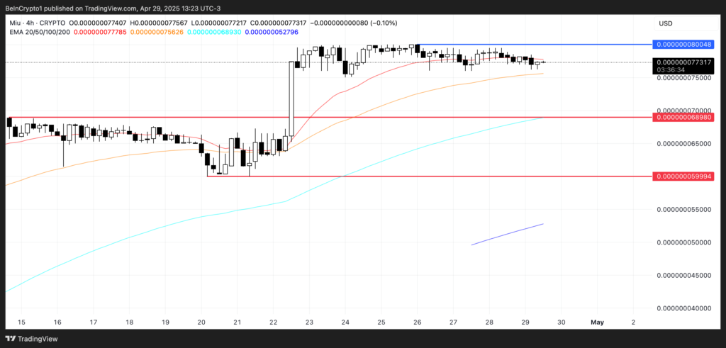 در صورت تداوم روند صعودی، قیمت میو میتواند سطح ۰.۰۰۰۰۰۰۰۸۰ دلاری را هدف قرار دهد.