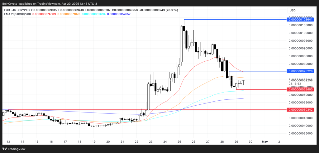 قیمت فاد اخیراً حمایت ۰.۰۰۰۰۰۰۰۶۳۴ دلاری را آزمایش کرده است. اگر این حمایت بار دیگر شکسته شود، هدف نزولی بعدی در حدود ۰.۰۰۰۰۰۰۰۵۰ خواهد بود.