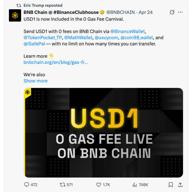 جالب آنکه USD1 روی بی ان بی چین (BNB Chain) راهاندازی شده؛ بلاکچینی که ابتدا توسط صرافی بایننس توسعه یافت. همین موضوع باعث شده شایعات درباره ارتباط پشتپرده میان خانواده ترامپ و بایننس دوباره بالا بگیرد.