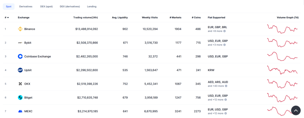 MEXC از نظر حجم معاملات یکی از بزرگترین صرافیهای رمزارز به شمار میرود و طبق دادههای کوین مارکت کپ، طی ۲۴ ساعت گذشته با پردازش بیش از ۳.۲ میلیارد دلار، در رتبه هفتم صرافیهای برتر بازار اسپات قرار داشته است.