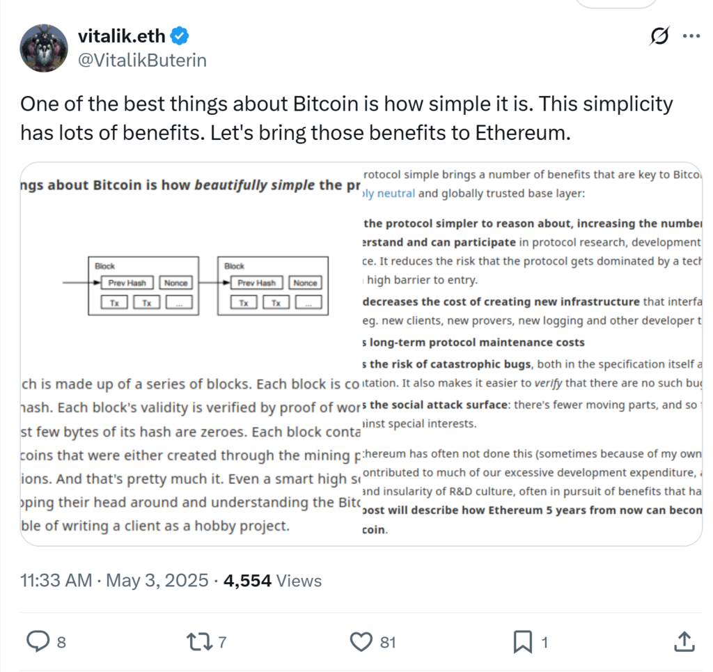 به گزارش میهن بلاکچین، او با الهام از طراحی مینیمالیستی بیت کوین، چشماندازی برای بازطراحی معماری اتریوم ارائه کرده که اجزای کلیدی مانند اجماع، اجرای تراکنشها و مولفههای مشترک را در بر میگیرد.