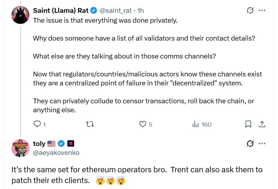 آناتولی یاکوونکو (Anatoly Yakovenko) – مدیرعامل سولانا لبز (Solana Labs) – مستقیماً این ادعاها را رد نکرد، اما گفت در جامعه اتریوم هم امکان هماهنگی برای رفع یک باگ مشابه وجود دارد. او افزود: