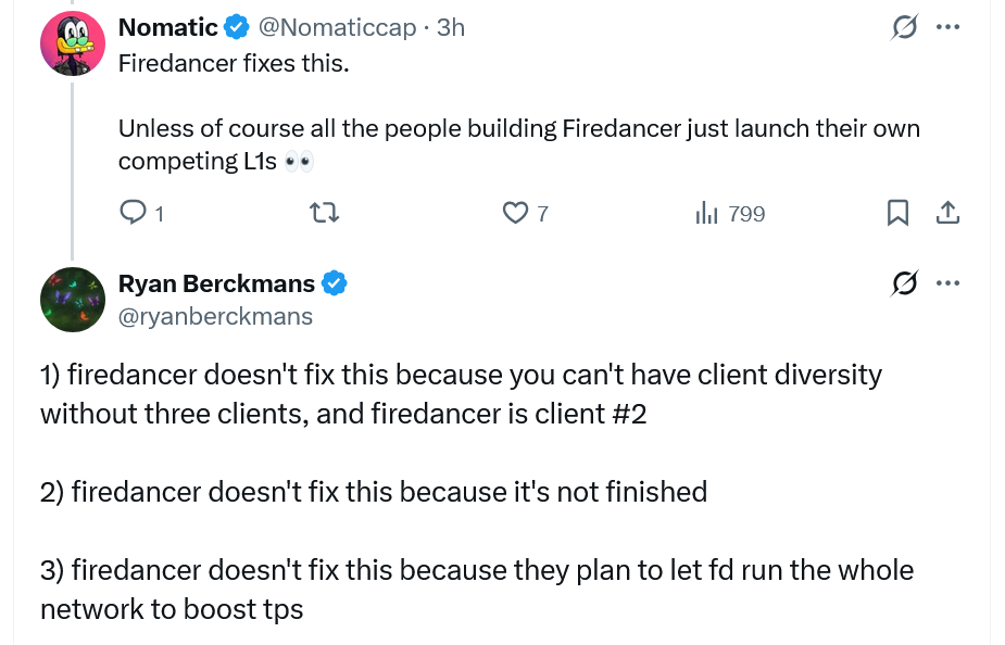 با این حال، برکمنز تاکید کرد برای رسیدن به غیرمتمرکزسازی واقعی در سطح کلاینت، سولانا باید دست کم سه کلاینت مجزا و فعال داشته باشد.